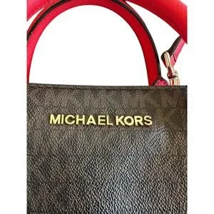 Carry your essentials in iconic style with this Michael Kors satchel, a chic blend of signature monogram canvas and vibrant red leather. The structured dome silhouette offers timeless elegance, while the contrasting red trim adds a pop of playful color. Gold-tone hardware, including the unmistakable MK charm and subtle logo plate, gleams with sophisticated luxury. Open the top zipper to reveal a thoughtfully organized interior, perfect for keeping your belongings secure and accessible. Imagine this statement piece completing your look for a glamorous evening out or adding a touch of designer flair to your everyday errands.