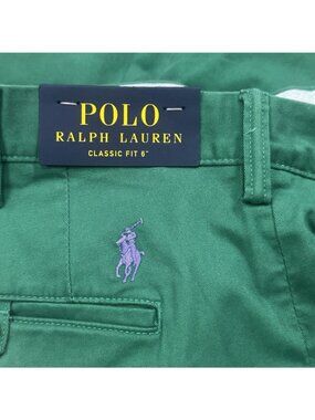 Brand: Polo Ralph Lauren Style: Classic Fit Chino Shorts Size: Men’s 38 Inseam: 6” Color: Green Material: 97% Cotton / 3% Elastane Fabric: Stretch cotton twill Closure: Zip fly with button Pockets: Front slant pockets, back button welt pockets Signature embroidered Pony logo on back Belt loops