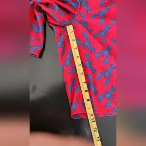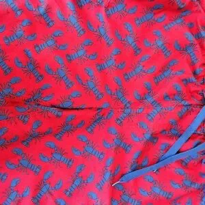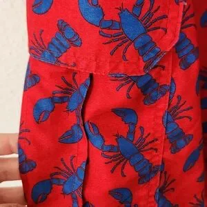 Bold red swim trunks with blue lobster pattern. Ideal for beach fun, possibly in Maine or Cape Cod😁