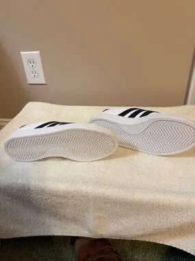 Sleek adidas low-top sneaker in white with black stripe detailing. Durable synthetic upper and cushioned sole. Clean, sporty silhouette for daily wear.