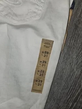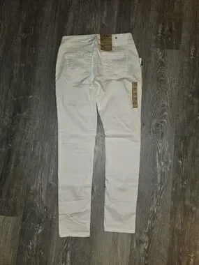 Slim women's jeans with a tapered silhouette. Soft fabric for comfortable wear. Neutral white tone for versatile styling. Subtle Silver Jeans branding on the waistband. Size 29x31.