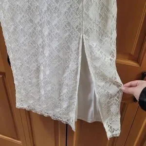 $119 retail, diamond pattern lace overlay with bustier/corset-style top, and structured seams to snatch the waist. Sexy thigh-high slit!
