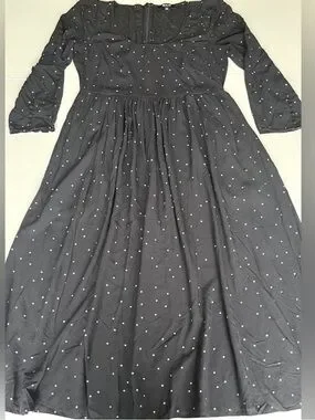 ADORABLE!!!!!! POCKETS!!! A flattering RELAXED FIT black LIGHTWEIGHT midi dress with all-over small white star polka dots. Features a scoop neckline, long sleeves, and a gathered waist for a feminine silhouette. Lightweight and versatile — perfect for day-to-night wear. Easy to style with boots or heels.