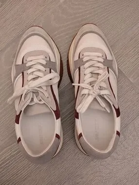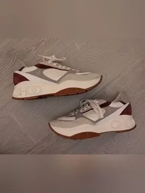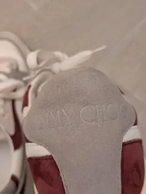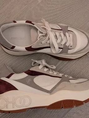 Jimmy Choo platform sneakers in white mesh with maroon and gray suede. Size 39. In excellent condition, only worn 2-3 times.