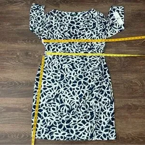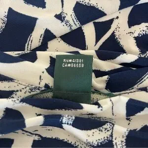 ⧫ Ralph Lauren Ruched Sheath Dress in navy blue and white abstract pattern