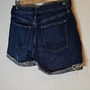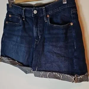 Stylish dark blue jean shorts. Features classic five-pocket design. Rolled hem for a casual look.