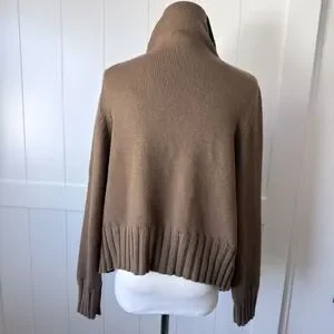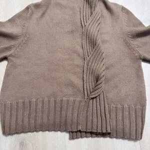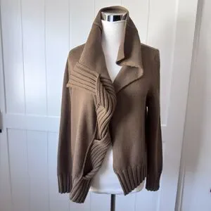 Just stunning! Crea Concept Paris architectural chunky knit open cardigan. Featuring an intentional asymmetrical twist neckline for a sophisticated Lagenlook aesthetic. 50% Virgin Wool blend, offering warmth with a soft, structured drape. The gorgeous tabacco brown hue makes it a versatile staple for Quiet Luxury or Minimalist styling.