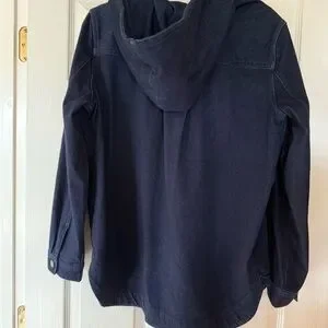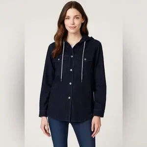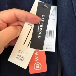 Denim Liverpool jacket with sleek silver buttons. Ideal for everyday style. Part of Liverpool’s eco conscious line. Indigo rinse, button front closure, two front chest pockets + 2 side entry pockets.