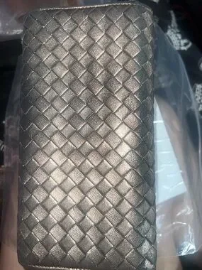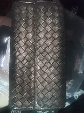 Classic Bottega Veneta intrecciato weave. Smooth black leather with refined sheen. Sleek fold design with tonal stitching. Timeless, versatile accessory.