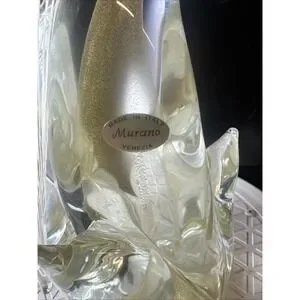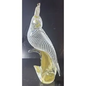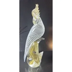 This Vintage Venetian Murano Gold Fleck White Optic Glass Cockatoo Parrots figurine is a beautiful piece of mid-century modern art glass from Italy. Handmade in Venice, this original piece features a glossy finish with a swirl pattern in white and gold colors. Standing at 13 inches tall and 4 inches wide, this 3D effect figurine captures the essence of birds with its intricate design and production technique of hand-blown glass. Perfect for collectors or those looking to add a touch of vintage charm to their decor, these Murano glass Cockatoo Parrots piece is a stunning representation of Italian craftsmanship.