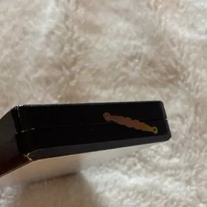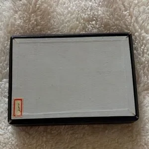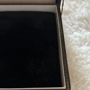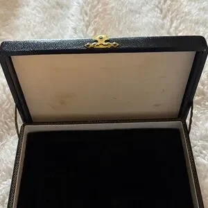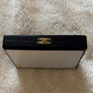 Compact vintage case. Black exterior with a gold-tone clasp. Keeps jewelry organized and accessible. Classic, understated style; unique