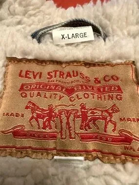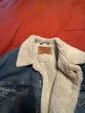 Classic sherpa-lined denim jacket in blue. Soft cream sherpa collar and interior for added warmth. Button-front closure and multiple pockets for everyday convenience. Versatile style that pairs well with casual looks.
