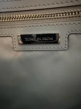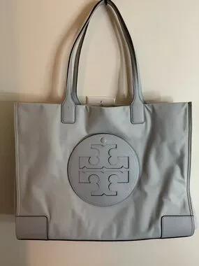 Authentic Tory Burch. Stylish blue/grey tote with a prominent circular logo patch. Smooth finish and double shoulder straps for easy carry. Neutral grey complements any outfit for daily use.