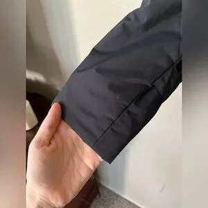 In good condition- small white marks on hood corner, sleeve cuff, and bottom of sleeve- probably will come out in wash but can't 100% guarantee. Few small loose strings that don't affect quality of jacket. Zippers have some color wear- few scratches but nothing too noticeable. Missing ski skirt that clips into jacket. No rips or tears. Has a lot of life left!