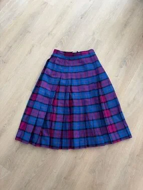 Vintage Wool Pleated Midi Skirt in Blue and Purple Plaid Size Small