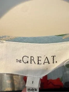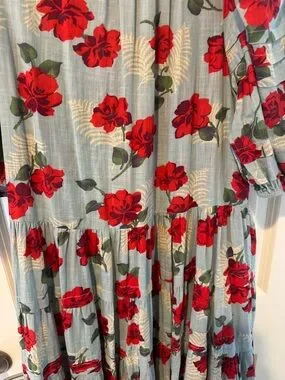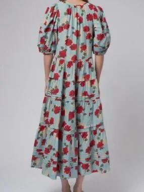 The Great - The Pleated Ravine Dress in Western Rose Print, size 1. Tiered midi dress with bold red floral print. Puff sleeves and button-front bodice. Flowy A-line silhouette. Lightweight, breezy fabric. Feminine and relaxed vibe. In great condition!