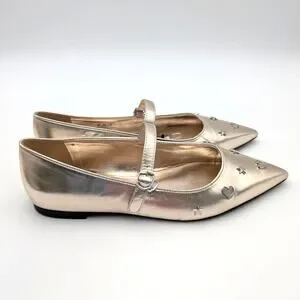 Playful studs in the shapes of hearts and stars twinkle with crystals on this reimagined mary jane boasting a metallic sheen and pointy toe.