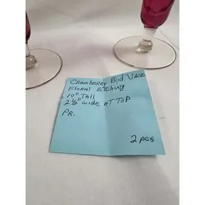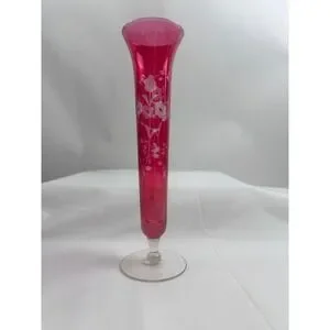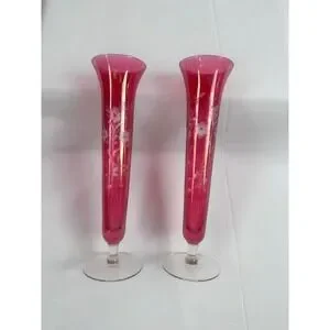 Keywords: ruby glass, etched vases, floral decor, vintage vases, trumpet vase, glassware, decorative, table centerpiece, wedding decor, anniversary gift, home accent, romantic, elegant