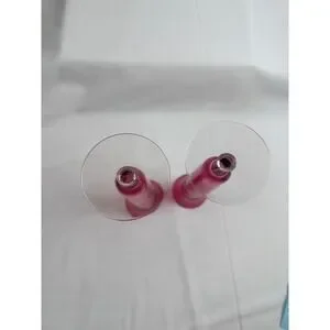 2 vintage ruby red glass handblown translucent bud vase with clear, round feet adorned with intricate etched floral motifs that catch the light beautifully. Imagine them gracing your dining table for a special occasion, adding a touch of elegance to your bedside table, or brightening your home office.