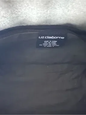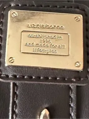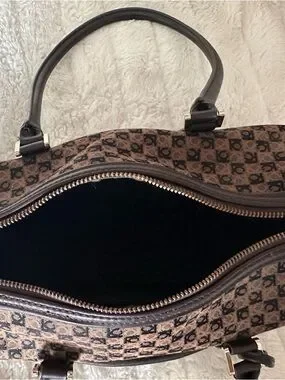 Liz Claiborne structured shoulder satchel with signature patterned fabric. Dark leather trim, straps, and accent panel. Purse has a pocket on each end and on the front. One zipper pocket on the inside. Polished gold-tone plaque and studs for detail. Sleek, everyday style that pairs easily with wardrobe staples.
