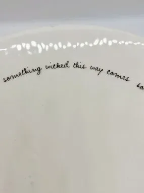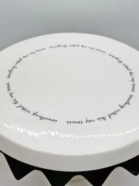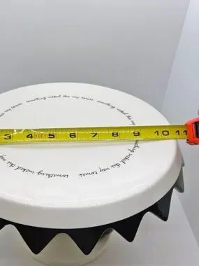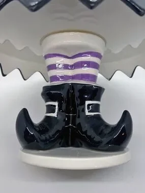 Adorable cake stand with purple and white striped stocking on witches feet.