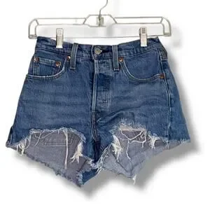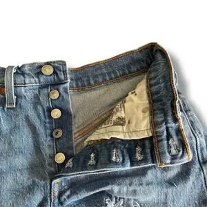 Levi’s 501 button fly cut off distressed denim shorts. High, raw ragged cut.