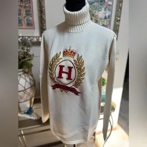 TOMMY HILFIGER Y2K cream, timeless , regal turtleneck sweater featuring an embroidered bold crest design and a classic style. Perfect blend of style and comfort. This beautiful sweater looks and feels brand new, in perfect condition. You’ll be sure to get compliments on this simply gorgeous sweater! Has a very generous pit to pit measurement of 21” ( could fit a medium) length is 26”. The large TH logo is everything, impeccable details ❤️
