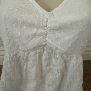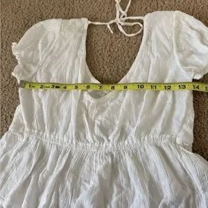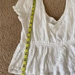 The perfect little white top for spring! This Hollister crop features romantic eyelet detailing and feminine puff sleeves. It has a very fitted silhouette with a low back and tie-string closure. See mannequin photos for fit reference!