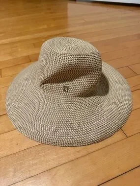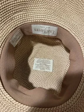 Elegant wide-brim straw hat by Eric Javits. Lightweight woven construction. Soft natural tan tone complements warm-weather looks. Provides stylish sun coverage.