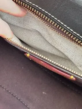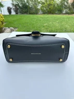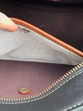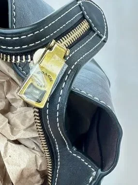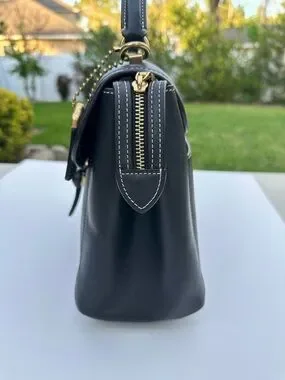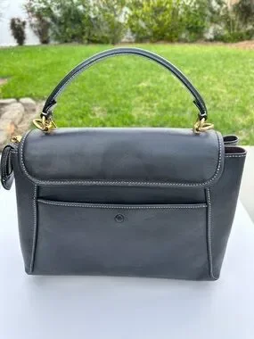 Structured Coach satchel in smooth black leather. Single top handle and flap closure. Contrast white stitching accents the panels. Polished gold-tone hardware and Coach tag detail. Sleek, versatile design for daily use. Very slight wear on front please see pics. No strap