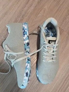 Breathable knit upper with lace-up design. Cushioned insole with blue camo print. Sleek, minimalist training shoe for gym or casual wear.
