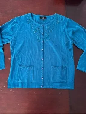 La Madona Teal Beaded Floral Embellished Cardigan Sweater Grandmacore Preppy