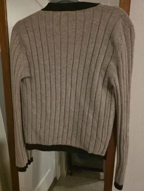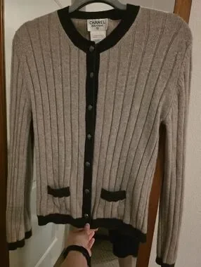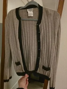 CHANEL Taupe and Black Ribbed Cashmere Cardigan