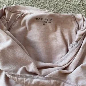 This pullover from Athleta is a great layering piece. Size XS in a lightweight fabric with blush pink space dye. The string is missing and the grommets at the neckline are chipped. Otherwise great and still fully functional and looks great on. Feel free to ask any additional questions!