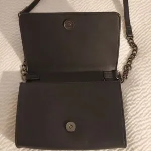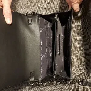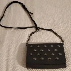 Sleek black crossbody bag with silver-tone stud embellishments. Features an adjustable leather strap and a chain-accent handle for versatile wear. Compact and stylish for everyday or evening use. Black color and silver hardware create a polished, modern look.