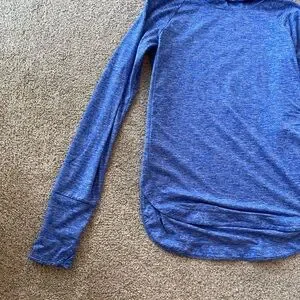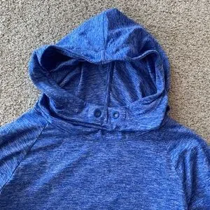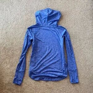 This pullover from Athleta is a great layering piece. Size XXS in a lightweight fabric with cobalt blue space dye. The string is missing, otherwise great and still fully functional and looks great on. Feel free to ask any additional questions!