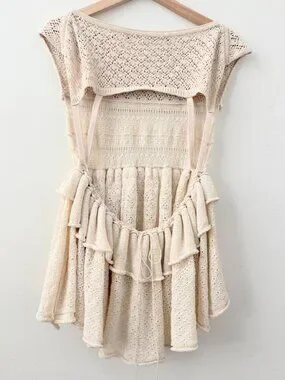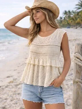 Free People Juliette ruffle top in a soft cream tone featuring intricate lace knit and a dramatic open back with adjustable tie detail. feminine, flowy silhouette perfect for boho, coastal, and coastal cowgirl styling.