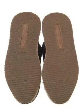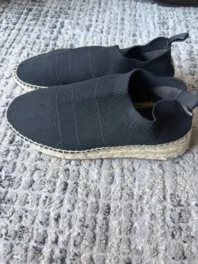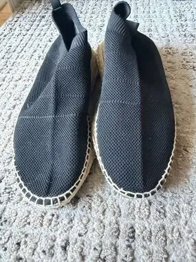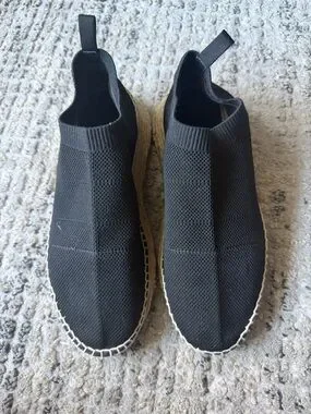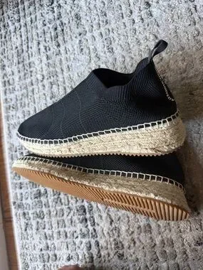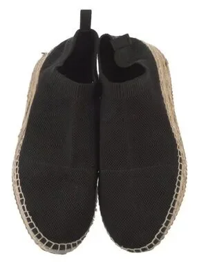 Sleek black knit upper with a slip-on sock fit. Espadrille-style jute-wrapped sole for casual flair. Pull tab at heel for easy on and off. Minimalist design pairs with many looks.