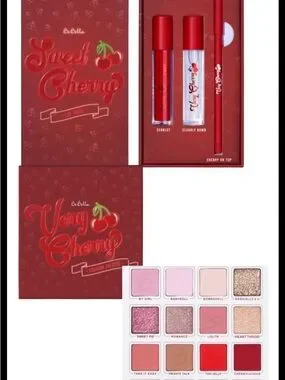 Very Cherry makeup set in red includes a versatile eyeshadow palette and matching lip products. Smooth, blendable eyeshadows range from soft pinks to shimmering golds for day-to-night looks. Includes a vivid red lip shade and clear gloss for lasting color and shine. Compact, coordinated red packaging for easy gifting and everyday use.