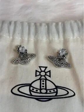 Vivienne Westwood stud earrings featuring the iconic orb design adorned with sparkling crystals. Crafted in silver tone metal, these earrings add a touch of luxury and sophistication to any outfit. Perfect for both casual and formal occasions. Comes with original branded pouch for storage.