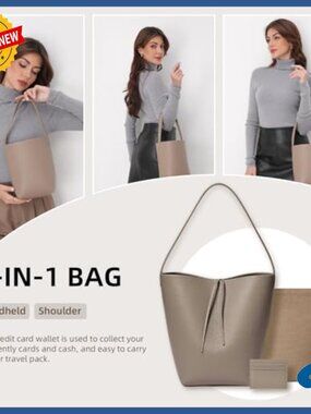 Genuine Leather Bucket Tote Bag with Credit Card Holder Wallet, Medium Size