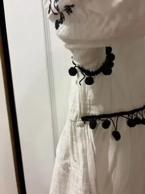 Featuring intricate black embroidery on soft ivory fabric and playful pom trim detailing, this top gives that relaxed, elevated bohemian vibe that’s always in demand.