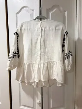 Zara Trafaluc Boho Embroidered Blouse | Pom Trim Peplum Top | Size L