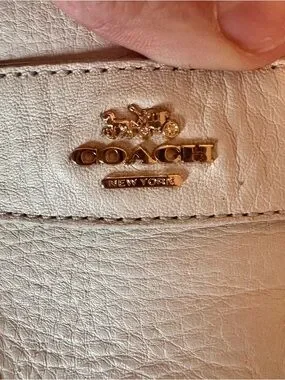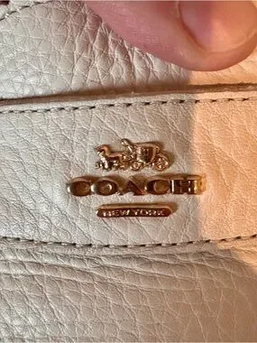 Elegant COACH penny loafers in cream leather. Pebbled leather upper with subtle stitch detailing. Gold-tone COACH logo hardware on vamp. Cushioned insole for comfortable wear. Timeless style for everyday outfits.