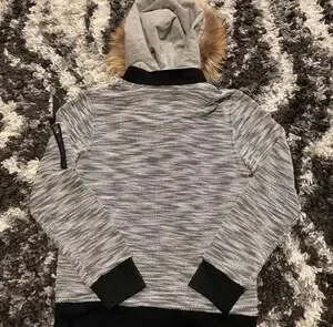 In the Attic Homme Japanese Brand Multi-Layered Knit Faux Fur Hoodie Jacket, Size M. This unique garment features a built-in layered look with a gray inner hoodie and a textured marled knit outer shell. The hood is trimmed with a plush faux fur for extra warmth and style. Details include a zippered sleeve pocket with 'Riders on the storm' text, black ribbed cuffs, and a ribbed hem. Practical outer pockets and a full-zip front closure. Good pre-owned condition with some light pilling consistent with normal wear. No major flaws or holes. Light storage smell
