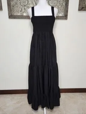 Chic black maxi dress with a smocked bodice and wide straps. Flowy tiered skirt creates effortless movement. Lightweight and versatile for day or evening wear. Features a comfortable fitted top and relaxed silhouette.