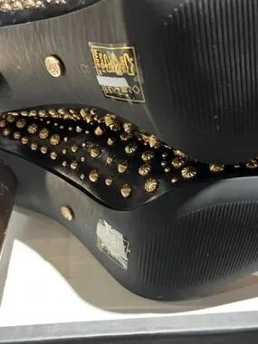 Stud-denly with the AZALEA WANG Grehgan Black Embellished Chunky Heel Bootie. Crafted from sleek faux leather, this bold bootie features a pointed toe, a metallic gold chunky heel, and a back zipper closure. It’s completely adorned with an assortment of shining, gold-tone stud embellishments.