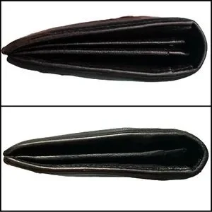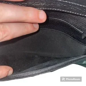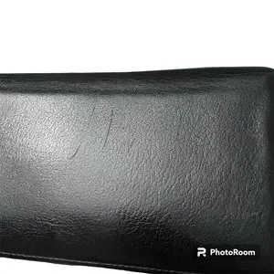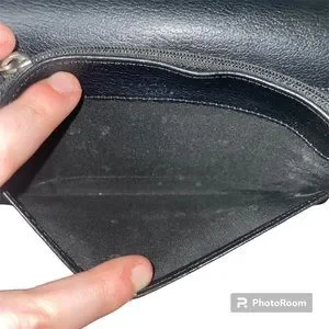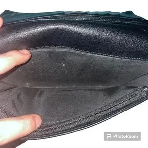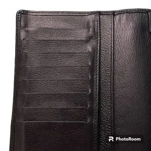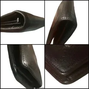VERY GOOD USED CONDITION - NO stains, holes or other major flaws! There is some light dirt/wear residue from normal use inside all of the pocket sections - see photos. There is are a couple LIGHT scratches in leather on back of wallet - you literally cannot see them unless holding the wallet in a certain angle in light. There is also significant creasing in the center fold of the wallet & some slight rubbing on leather & stretching of the inside card holder sections - both normal wear from use! SEE LAST 3 CLOSEUP PHOTOS FOR CLOSEUPS OF DESCRIBED FLAWS!
