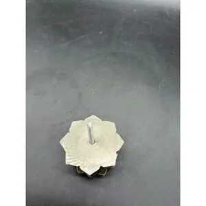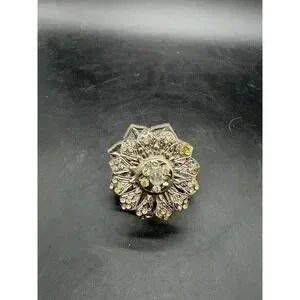 Vintage-inspired drawer pull or furniture knob featuring a tiered floral rosette design. This decorative hardware is crafted from cast metal with an antiqued silver-tone finish and is embellished with clear and yellow-tinted rhinestones for a touch of glam. The layered petal structure adds depth and architectural interest to cabinets, dressers, or vanity drawers. It includes a standard threaded screw for easy installation. Note that some stones show age-related discoloration or darkening, enhancing its authentic vintage character.