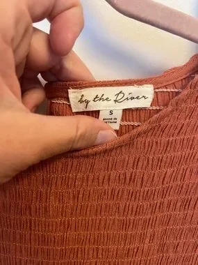 Smocked bodice with flutter sleeves. Tiered skirt for soft movement. Lightweight, breathable fabric. Warm rust hue easy to style.